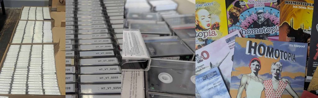 Once we had the camera plugged in and started skimming through tapes with these incredible names, it felt obvious that this stuff had to be made available, even if that meant blanketly assigning them a slightly less personal catalogue number onto it – they could still keep their original names. Sorting through things means you’re putting them in constant dialogue with one another, and you can see patterns emerge even beyone the boundaries of the festival itself. Venues that have sprung up and disappeared from the programme altogether, whether through gentrification of the city, a lack of interest in queer culture or perhaps for other, less alarming, reasons. You see artists and audiences returning again and again, updating their concerns as climates in the personal and political fluctuate. And the festival’s various names: what does a shift from: ‘A Queer New World’ and ‘From Liverpool With Love’ to ‘Queer Joy is A Protest’ and ‘Uprising’ tell us? It’s so rare to be granted such a macro perspective, especially over a festival I’ve had minimal first hand experience of, mostly due to my age and having not grown up in Liverpool.